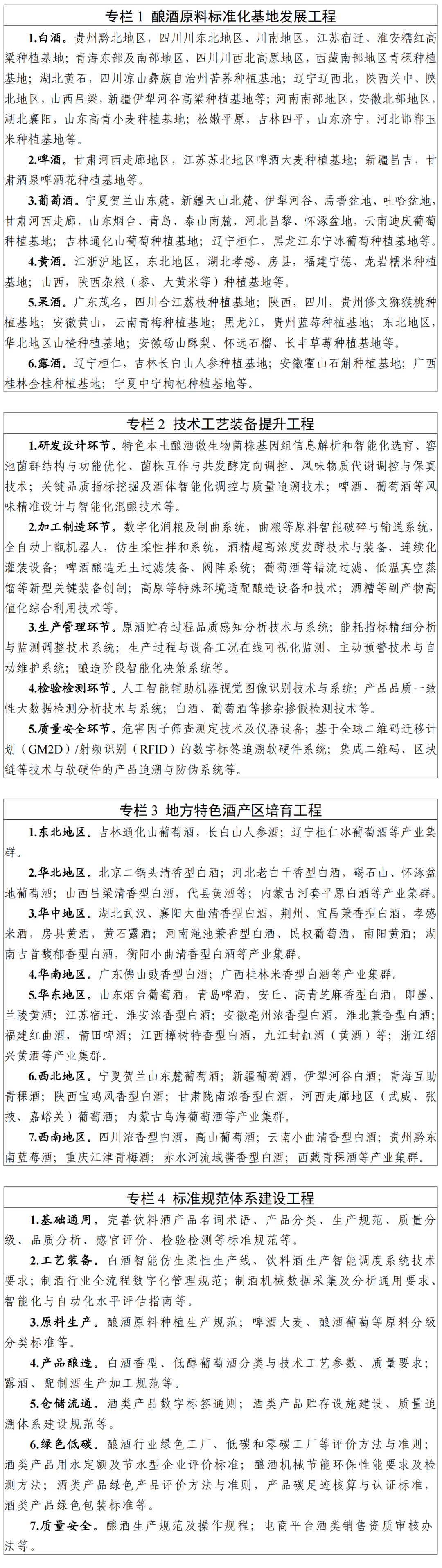 各省、自治区、曲辖市及打算单列市、新疆出产扶植兵团工业和消息化从管部分,人力资本社会保障厅(局),市场监管局(厅、委):现将《酿酒财产提质升级指点看法(2026—2030年)》印发给你们,请连系现实认实抓好落实。酿酒财产是我国保守劣势财产和根本平易近出产业,正在传承中汉文化、成长区域经济、推进村落复兴、带动就业增收等方面阐扬主要感化。为落实《工业和消息化部等八部分关于加速保守制制业转型升级的指点看法》,鞭策酿酒财产自动顺应市场需求新变化,实现高质量成长,制定本看法。以习新时代中国特色社会从义思惟为指点,深切贯彻落练习总关于推进保守财产转型升级主要,深切贯彻党的二十大和二十届历次全会,完整、全面贯彻新成长,以人平易近为核心的成长思惟,不竭加强酿酒财产供需适配性,以高质量供给创制无效需求,以文化赋能推进品牌扶植,以国际化成长培育增加空间,阐扬沉点产区、财产园区、龙头企业引领感化,支撑酿酒财产新业态新模式成长,、科学健康的酒文化和消费,加业自律,营制“百花齐放”成长款式,鞭策财产高质量成长。到2028年,原料种植、出产酿制、畅通消费融合成长程度持续优化,产物丰硕度、质量承认度、品牌佳誉度较着加强,企业出产体例、运营模式加速转型升级,消费场景和消费模式持续丰硕拓展。财产结构进一步优化,产区引领、园区驱动感化进一步加强,培育3个以上千亿级保守劣势酒产区,10个以上百亿级特色酿酒财产园区,构成“百亿园区、千亿集群、万亿财产”成长款式,尺度供给、质量平安、人才培育等配套能力扶植取得积极进展。到2030年,数智化、绿色化、国际化成长程度持续提拔,成长质量效益大幅提高,财产规模稳中有进,产能结构、产物布局持续优化,构成产物品种丰硕、出产畅通有序、区域结构合理、财产生态健康的财产系统。1。丰硕酿酒公用原料。加强高粱、大麦、酿酒葡萄、酿酒青稞等特色酿酒原料品种培育推广,支撑适宜酿酒的新原料品种拓展。激励高校、科研机构取企业结合攻关,培育率高、风味物质富集、抗逆性强的公用原料品种。加强对本土酿酒微生物菌种的筛拔取开辟使用,提拔出产菌株取加工工艺的适配性。2。强化原料种植扶植。鞭策酿酒原料公用化、规模化、无机化成长,指点产区因地制宜加强酿酒原料尺度化扶植,提拔全流程质量平安节制能力。激励产区集成卫星遥感、无人机光谱取物联网传感器等手艺配备,提高原料出产全过程机械化程度,配套扶植原料初加工设备和仓储物流系统,提拔分级筛选、烘干储存等尺度化质量管控能力。3。完美联农带农机制。支撑处所和酿酒企业成立原料供需对接平台,推进原料供给取酿制需求精准婚配,降低畅通成本。支撑酿酒企业通过订单收购、成立风险基金、加工增值返还、参股入股等形式,取新型运营从体结成持久不变产销关系,实现风险收益共享,构成持久不变优良原料供应来历。4。加速手艺传承立异成长。支撑优秀菌株(群)创制取使用、养分靶向设想、风味质量调控等环节手艺研发。激励企业开展保守酿制工艺尺度化、数字化研究,使用微生物组学、代谢组学、风味组学等手艺,解析窖池菌群、酒曲发酵、葡萄浸渍发酵等工艺参数和物质成分,由“经验酿制”向科学酿制、智能酿制转型,推进正在线智能化查验检测手艺研发使用,提拔质量不变性取出产效率。5。提高配备研发使用程度。激励酿酒企业、配备制制企业、科研机构组建酿酒手艺配备立异使用结合体,开展高精度传感器、智能温控系统、高效膜分手系统等焦点部件攻关,加速余热收受接管安拆、机械式蒸汽再压缩手艺(MVR)蒸发系统、从动上甑机械人、高速一体化灌拆设备等先辈合用配备研发使用。激励企业开展手艺,操纵“首台(套)”“首版次”等政策,支撑严沉手艺配备使用推广。6。提拔产物创制开辟能力。支撑企业打制劣势大单品系列,顺应个性化、时髦化、健康化消费趋向,对酒体设想、养分特征、消费偏好、风行趋向等数据进行深度挖掘和合理开辟,向“精酿酒”“特色酒”等产物类型拓展,推广柔性设想、定制出产、个性消费,开辟特色果露酒、精酿啤酒、即饮预调酒、跨界融合型食物等,支撑威士忌、白兰地、伏特加等产物本土化成长。7。加强优良企业梯度培育。支撑企业阐扬手艺工艺、品牌渠道等劣势,带动财产链上下逛一体化成长,有序开展产能合做,成长集团型企业。支撑企业深耕劣势范畴,环绕菌株优化、智能酿制、副产品高值化分析操纵等标的目的,培育一批细分范畴专精特新中小企业、科技和立异型中小企业。支撑大中小企业融通成长,打制区域聪慧供应链和立异结合体,成长平台经济、总部经济、零工经济等。8。因地制宜加强产区扶植。激励各地深切挖掘天然风土、汗青文化、产物气概等资本禀赋和比力劣势,明白成长定位,塑制焦点合作力,实现酿酒财产多元化、差同化成长。以特定地舆区域为依托,支撑附近产区整合伙本、塑制同一品牌,冲破分离化、同质化成长瓶颈,打制酿酒财产“大产区”。指点产区优化空间、产能等结构,加强仓储物流、污水处置等设备扶植,提拔工业设想、检测认证等公共办事能力。支撑有前提的白酒财产集聚区创开国家级开辟区。9。推进跨区域财产分工协做。激励处所充实阐扬